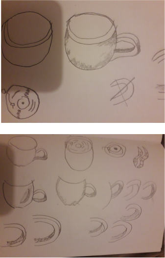 Toen ik de schetsen eenmaal had gemaakt heb ik deze gescand zodat ik ze in Adobe Illustrator kon voegen. Het overtrekken van de schetsen bleek een stuk gemakkelijker en al gauw had ik meerdere versies van de koffiemok klaar, zowel in zwart als in een kleurenpalet dat ik voor ogen had. Verschillende versies van het oor van de mok zijn op de afbeelding te zien. Dat was het moment waarop ik de opzet van de schetsen moest verlaten want het gaf niet het juiste resultaat.