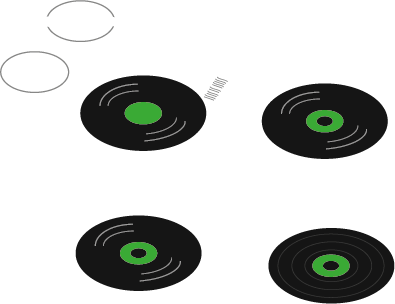 De grammofoonplaat kon ik maken door middel van de ellips van de koffiemok. Ik heb een aantal patronen geprobeerd om de ringen van de plaat weer te geven. De versie die ik uiteindelijk het gebruikt staat rechtsonderin, de grijze ringen heb ik vervaagd waardoor ze meer op groeven dan op lijnen lijken.